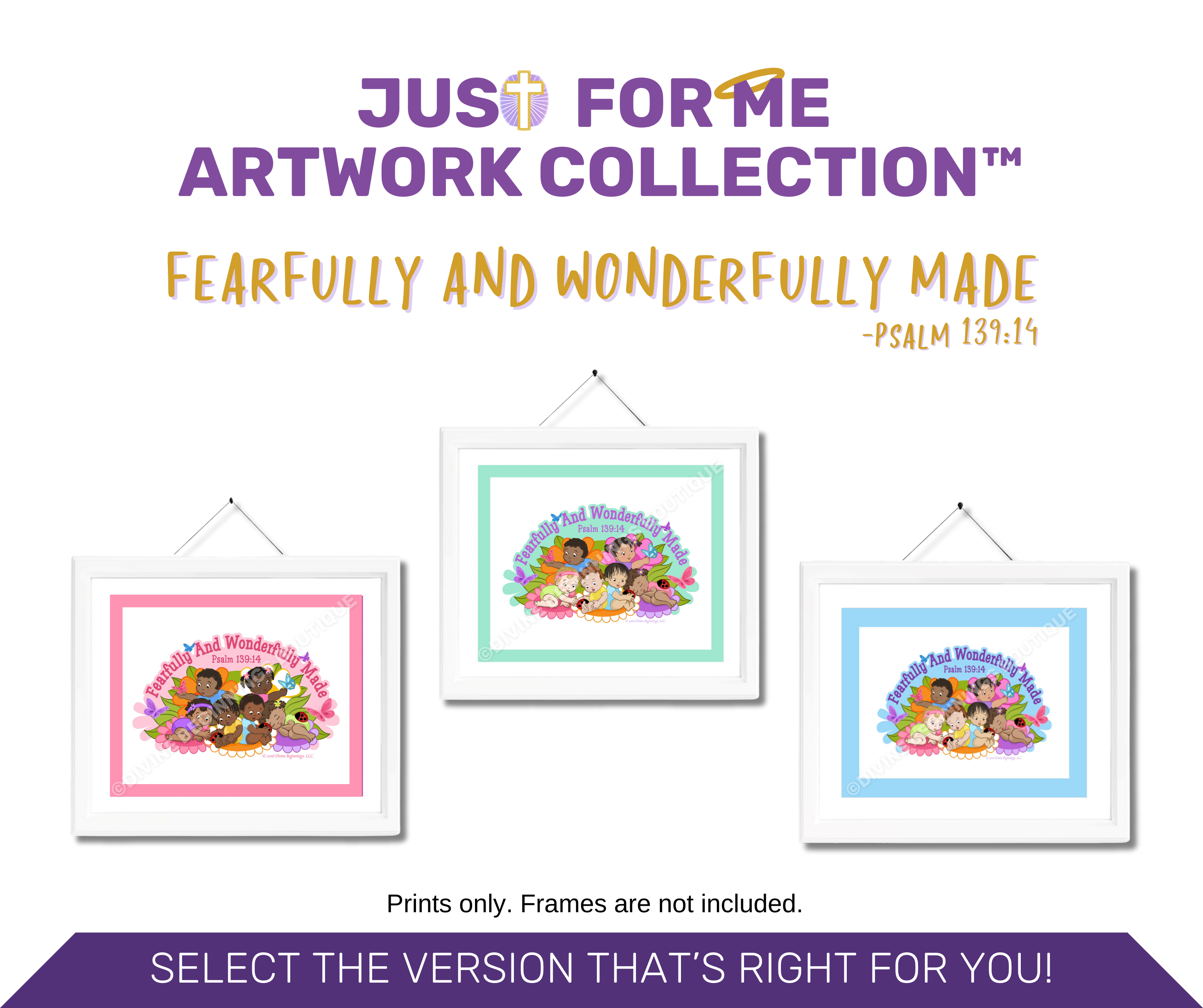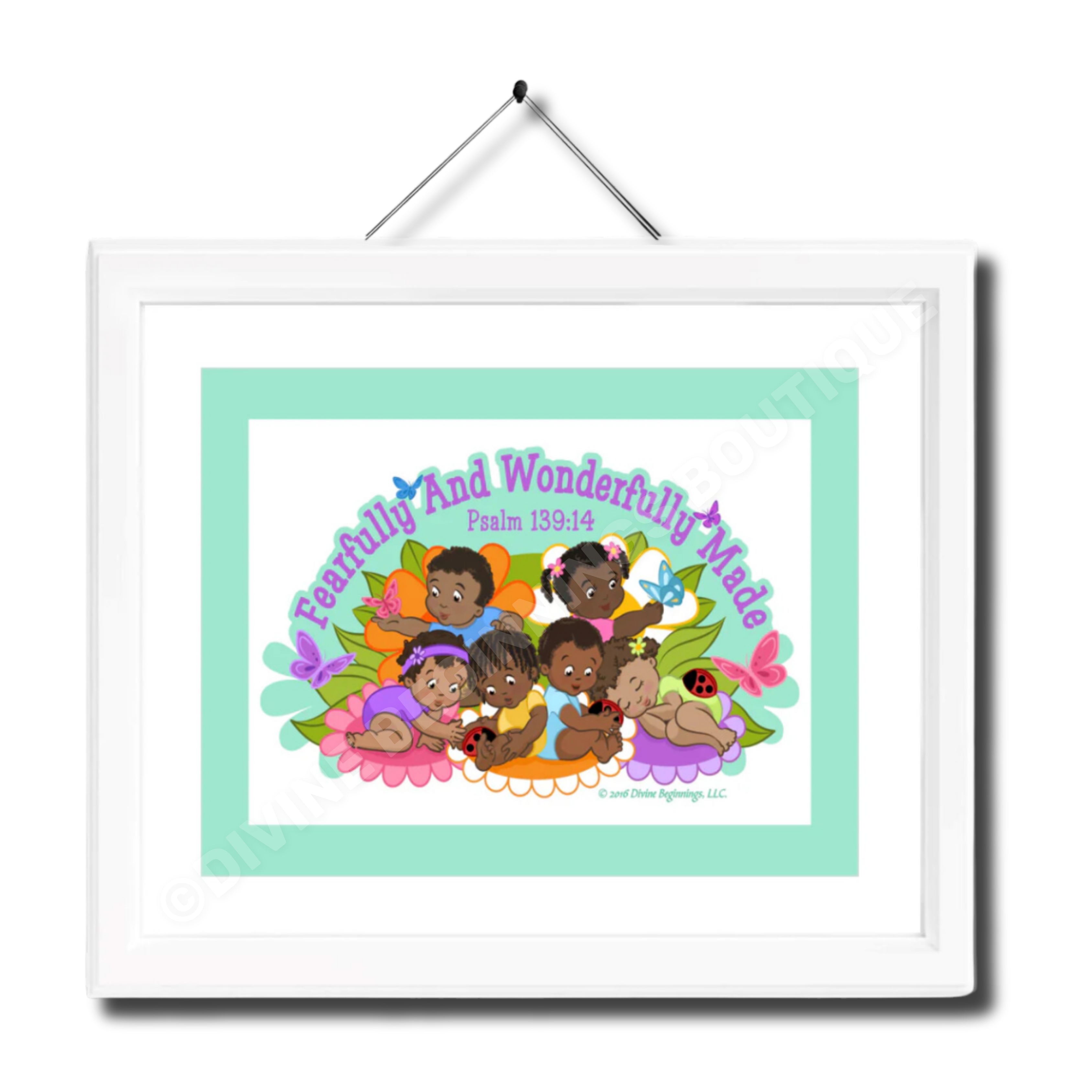 Our exclusive Fearfully and Wonderfully Made Christian artwork highlights the beauty and magnificence of God's children - and is a wonderful reminder to His little ones how special they are to Him. The beautiful design is based on Biblical scripture: "I praise you because I am fearfully and wonderfully made; your works are wonderful, I know that full well." Psalm 139:14