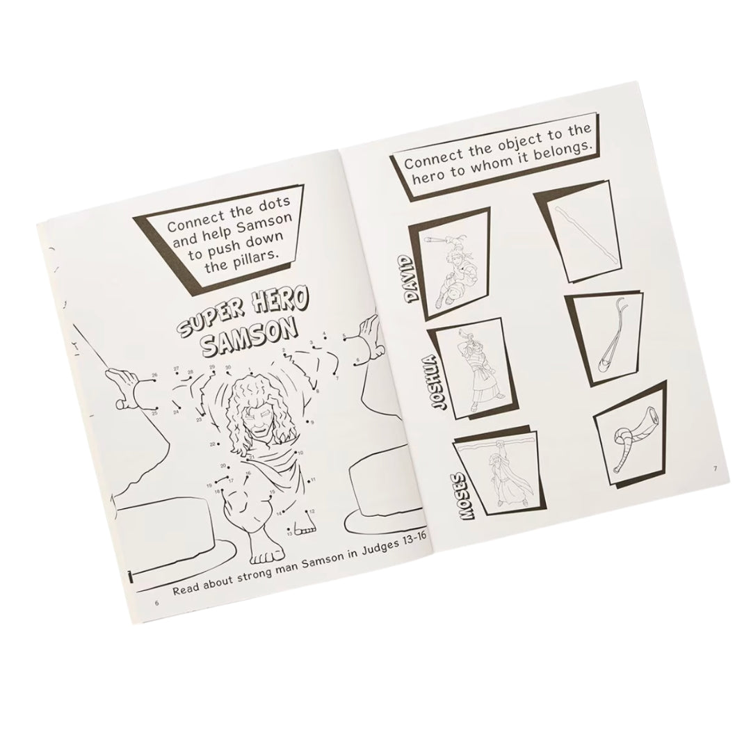 Inside, children will get to know Bible heroes like Adam, Noah, Moses, Samson, David, and Daniel through a variety of fun activities. Each hero includes a Scripture reference so kids can explore their story straight from the greatest hero book of all time—the Bible! Coloring pages, puzzles, mazes, word scrambles, and more spark imagination while helping kids understand God’s purpose in every story.